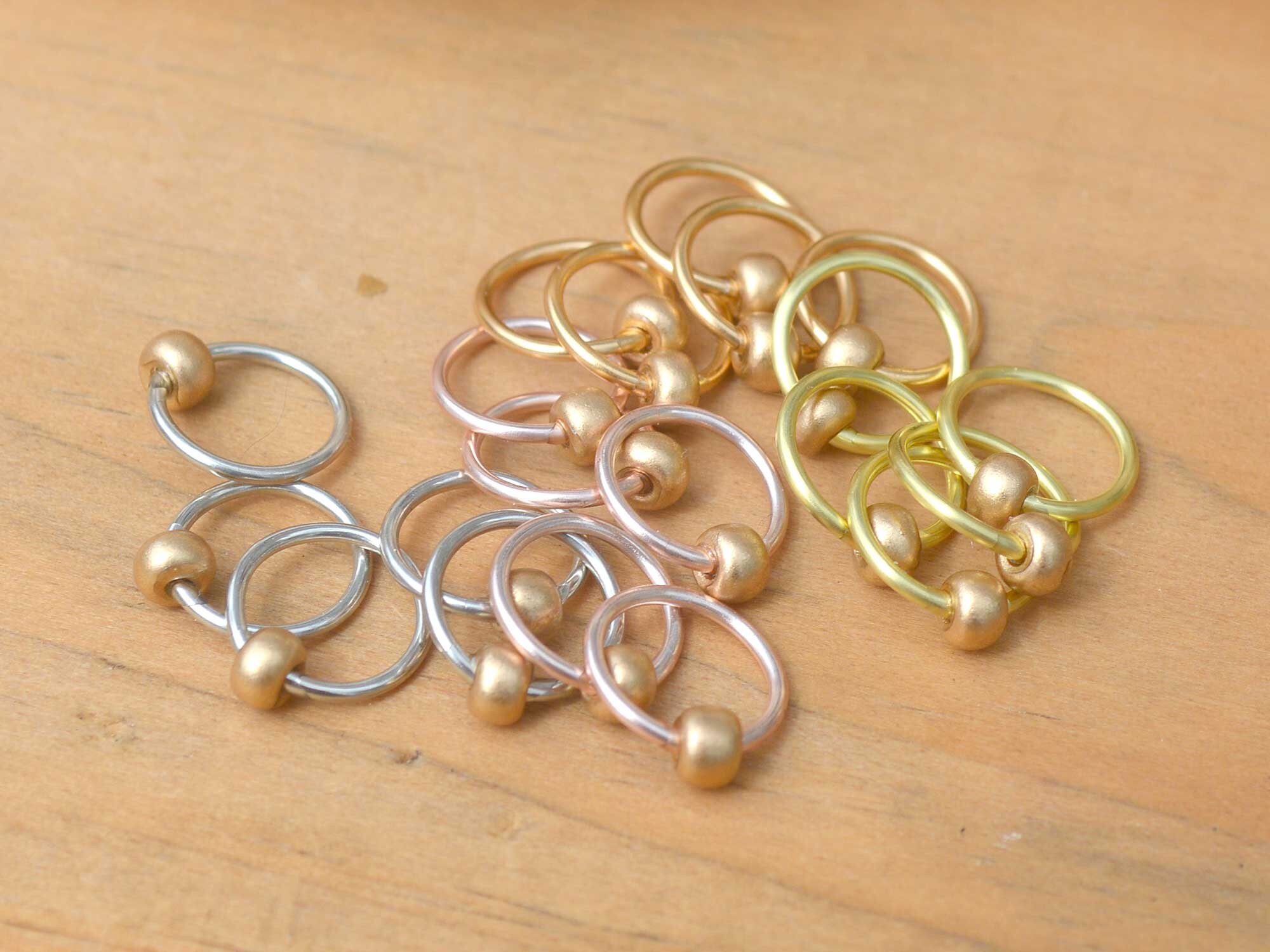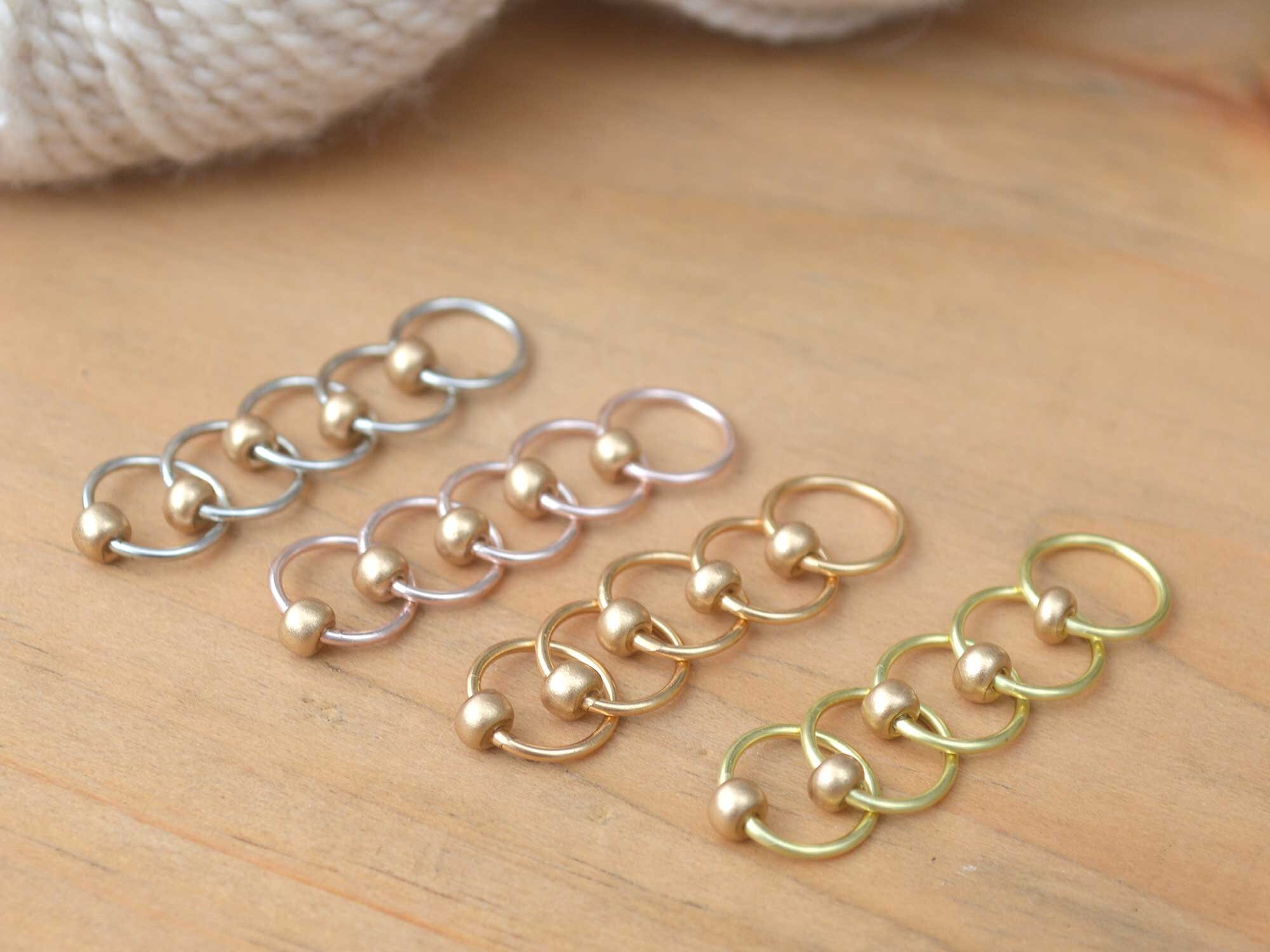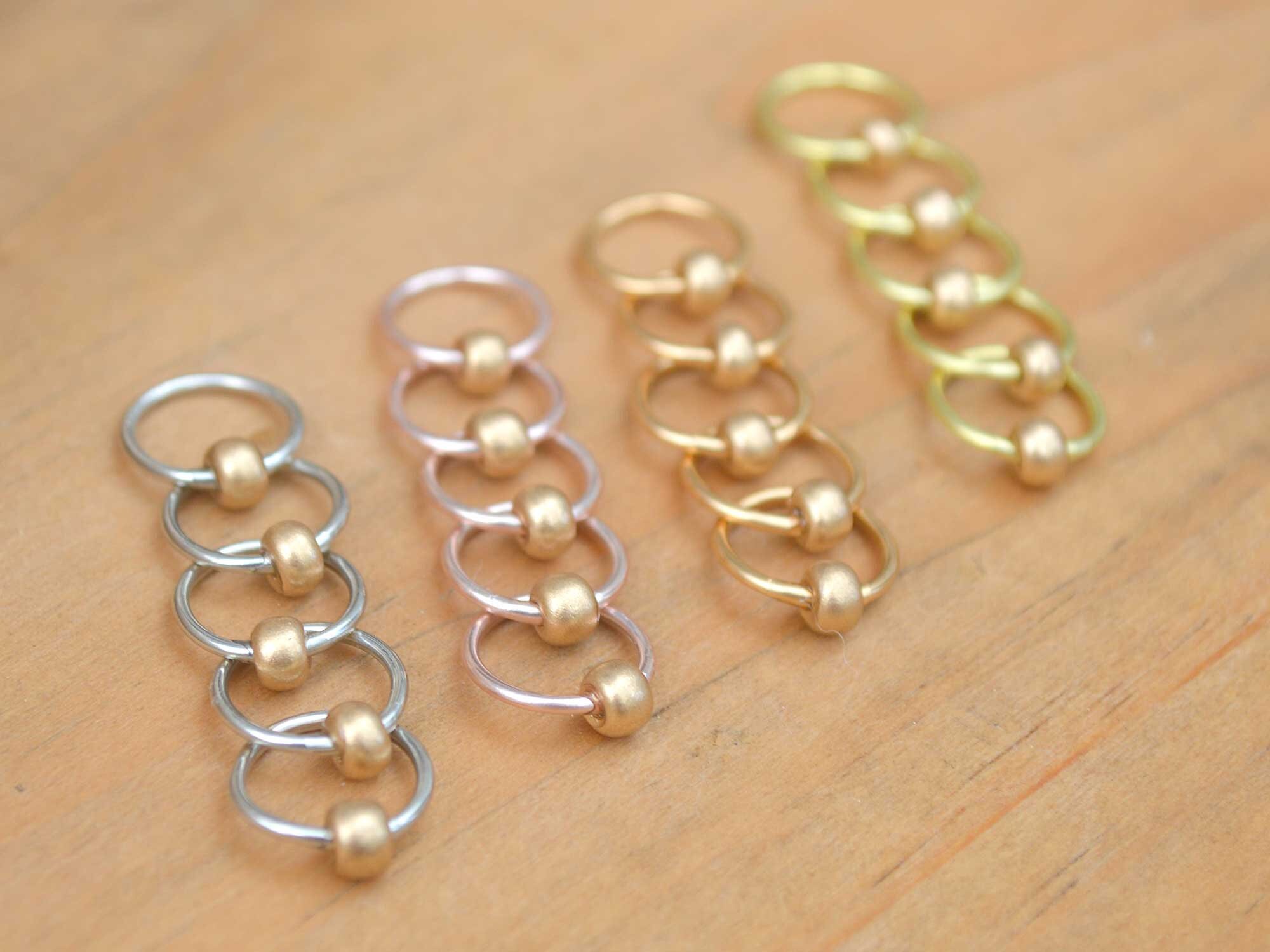The subtle shift in wire color from silver, rose gold, soft brass and yellow brass are paired with metallic gold beads creating an overall warm glow in this set of knitting stitch markers. Each set will include an equal number of each of the four colors represented in this design and are formed from 18 gauge wire.