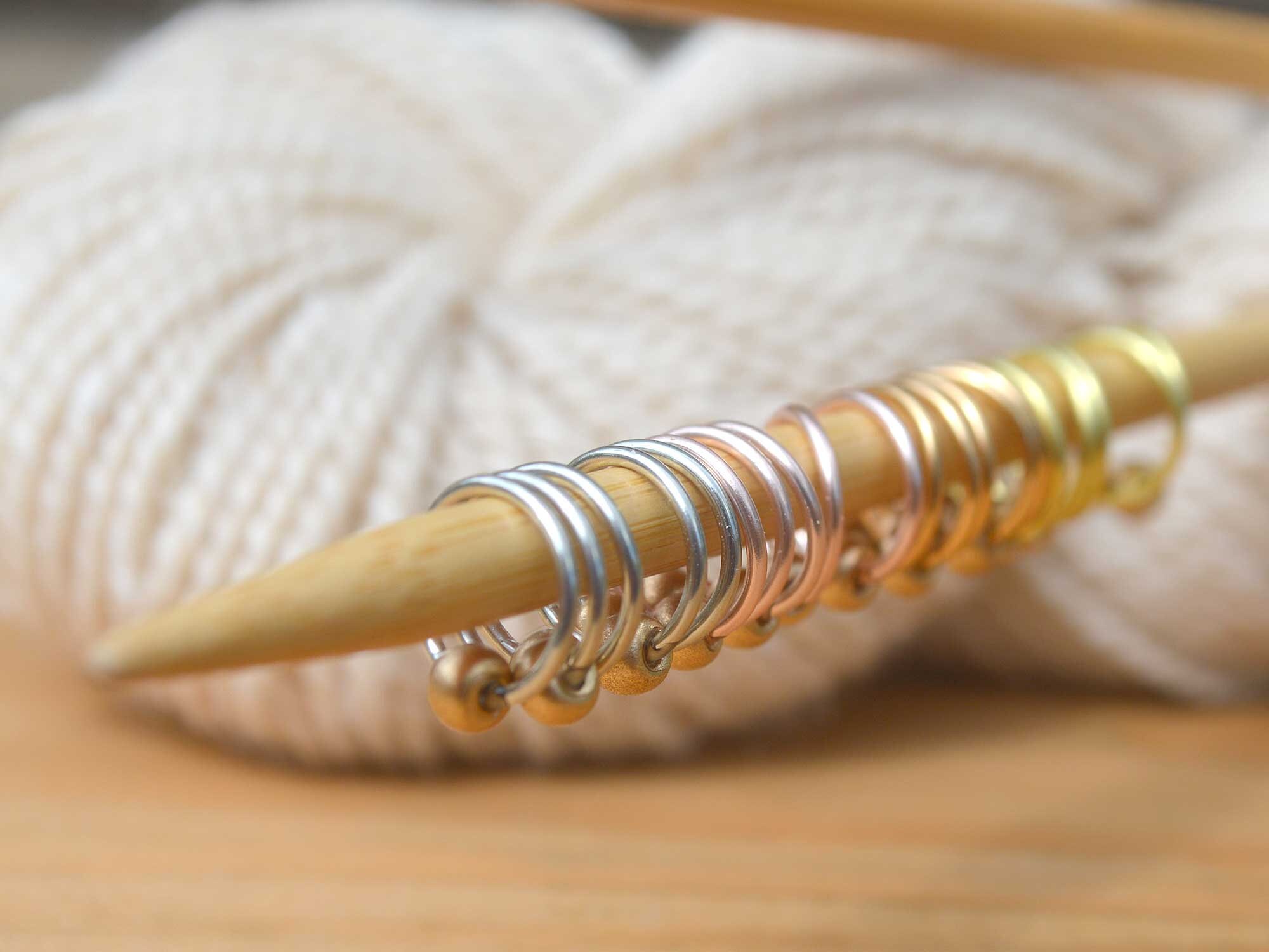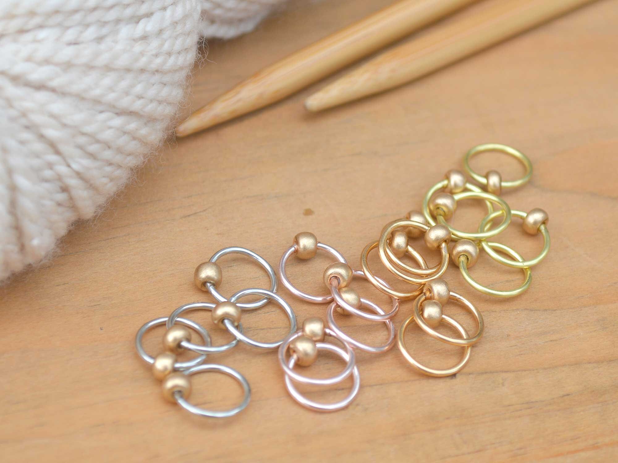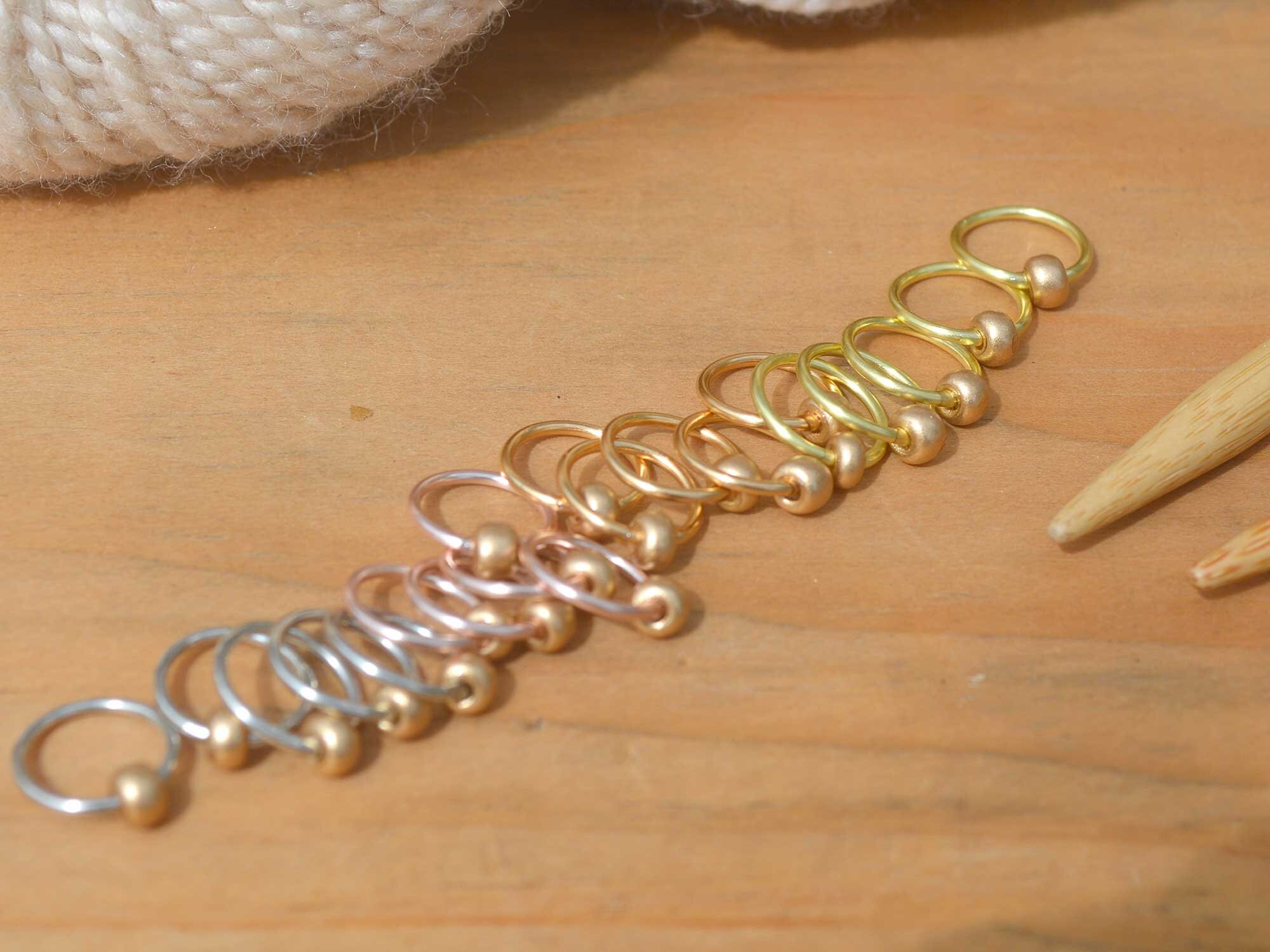 The subtle shift in wire color from silver, rose gold, soft brass and yellow brass are paired with metallic gold beads creating an overall warm glow in this set of knitting stitch markers. Each set will include an equal number of each of the four colors represented in this design and are formed from 18 gauge wire.