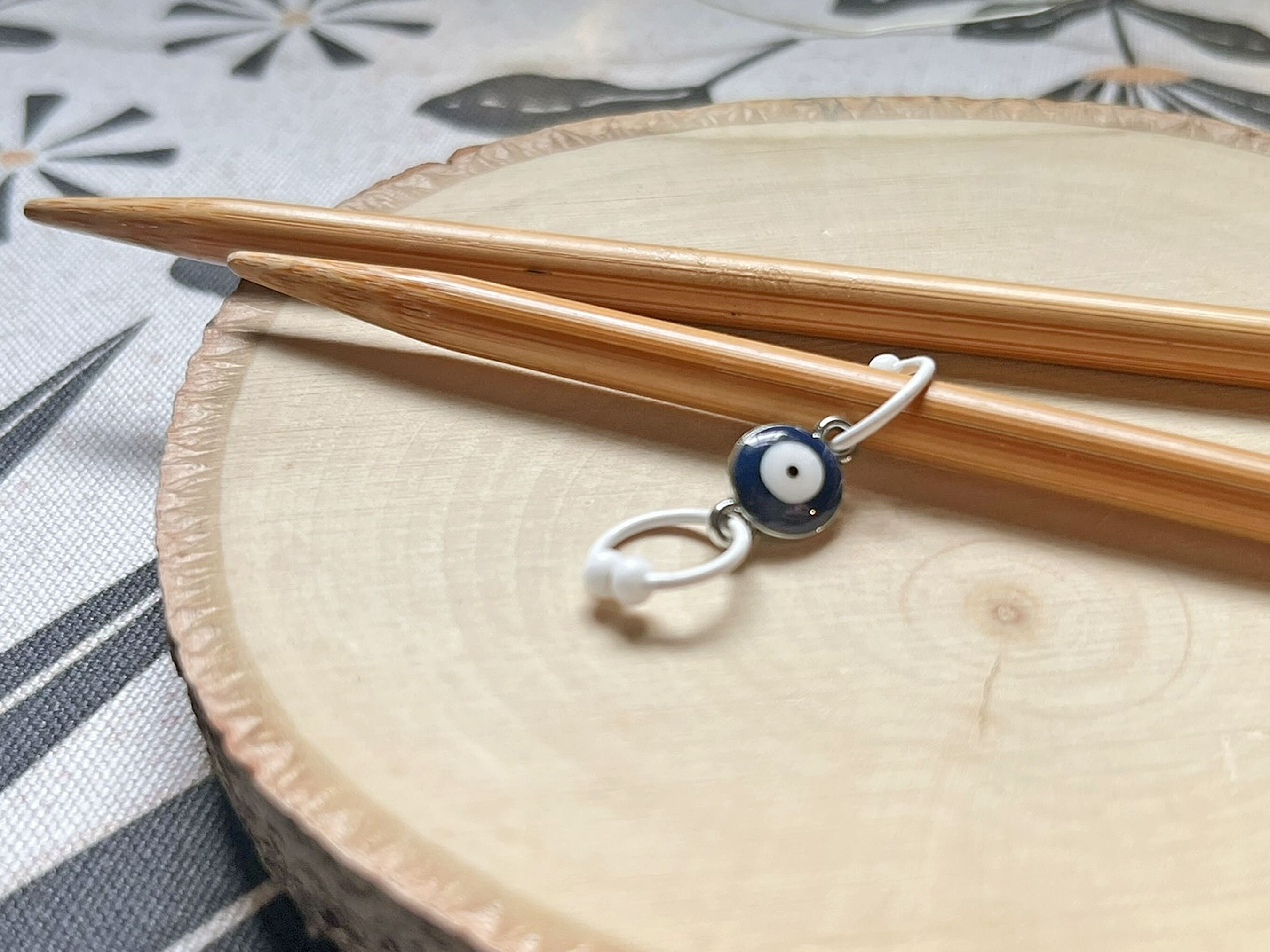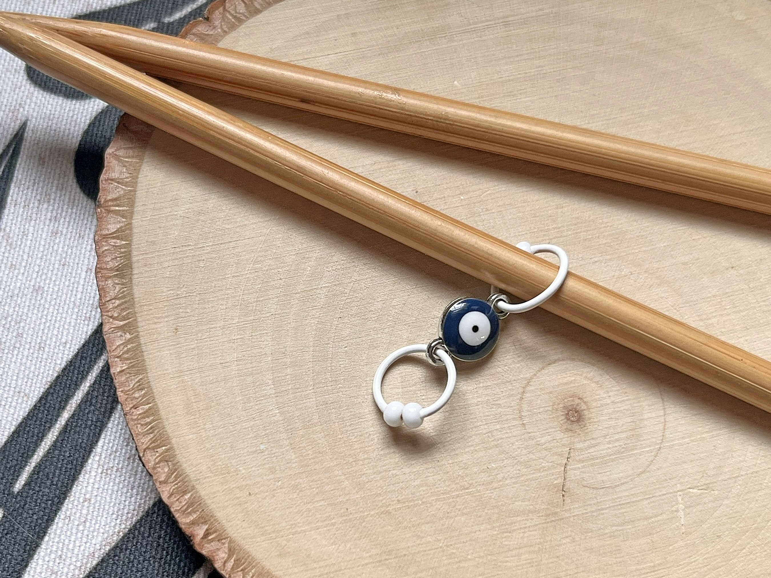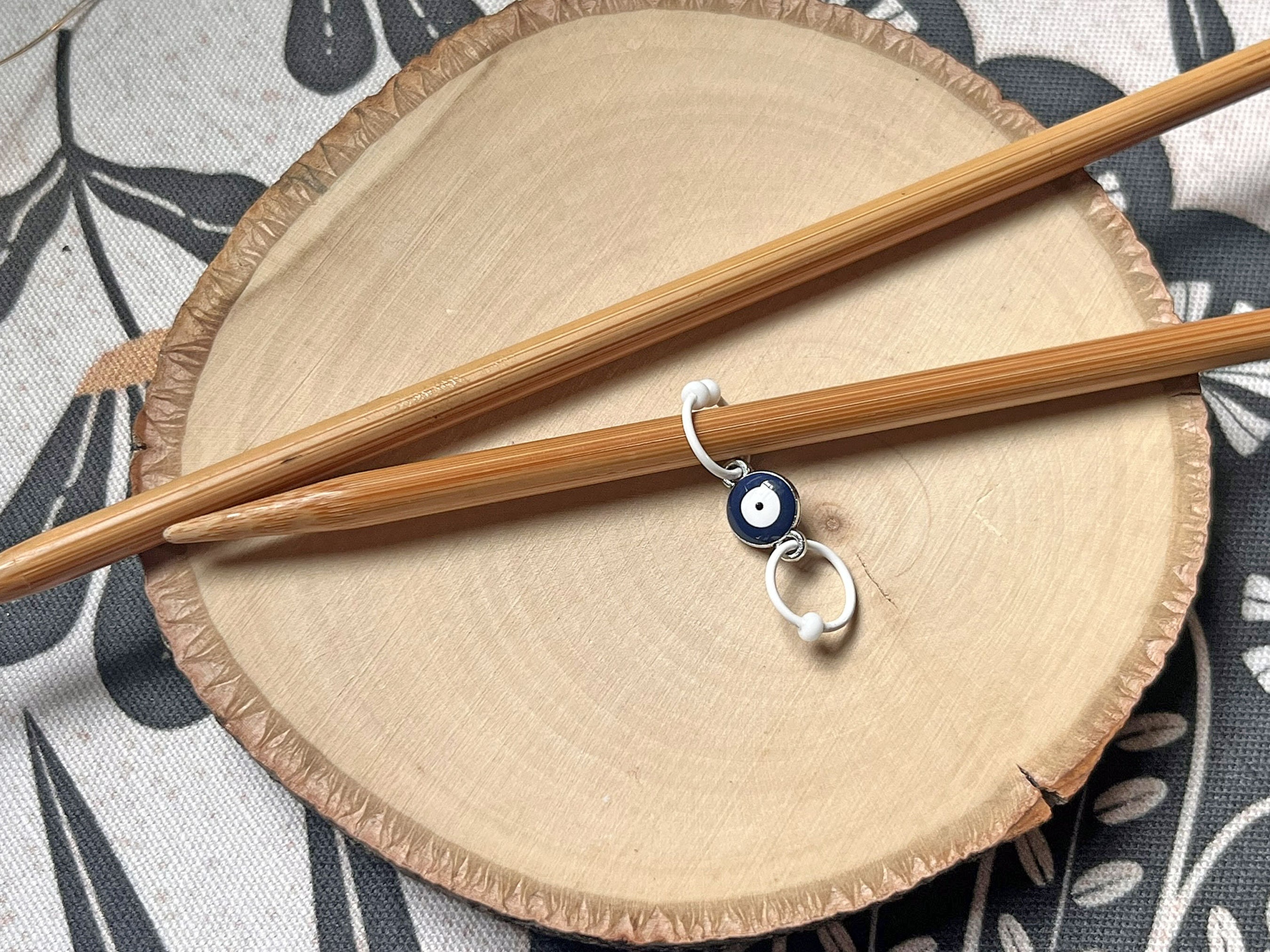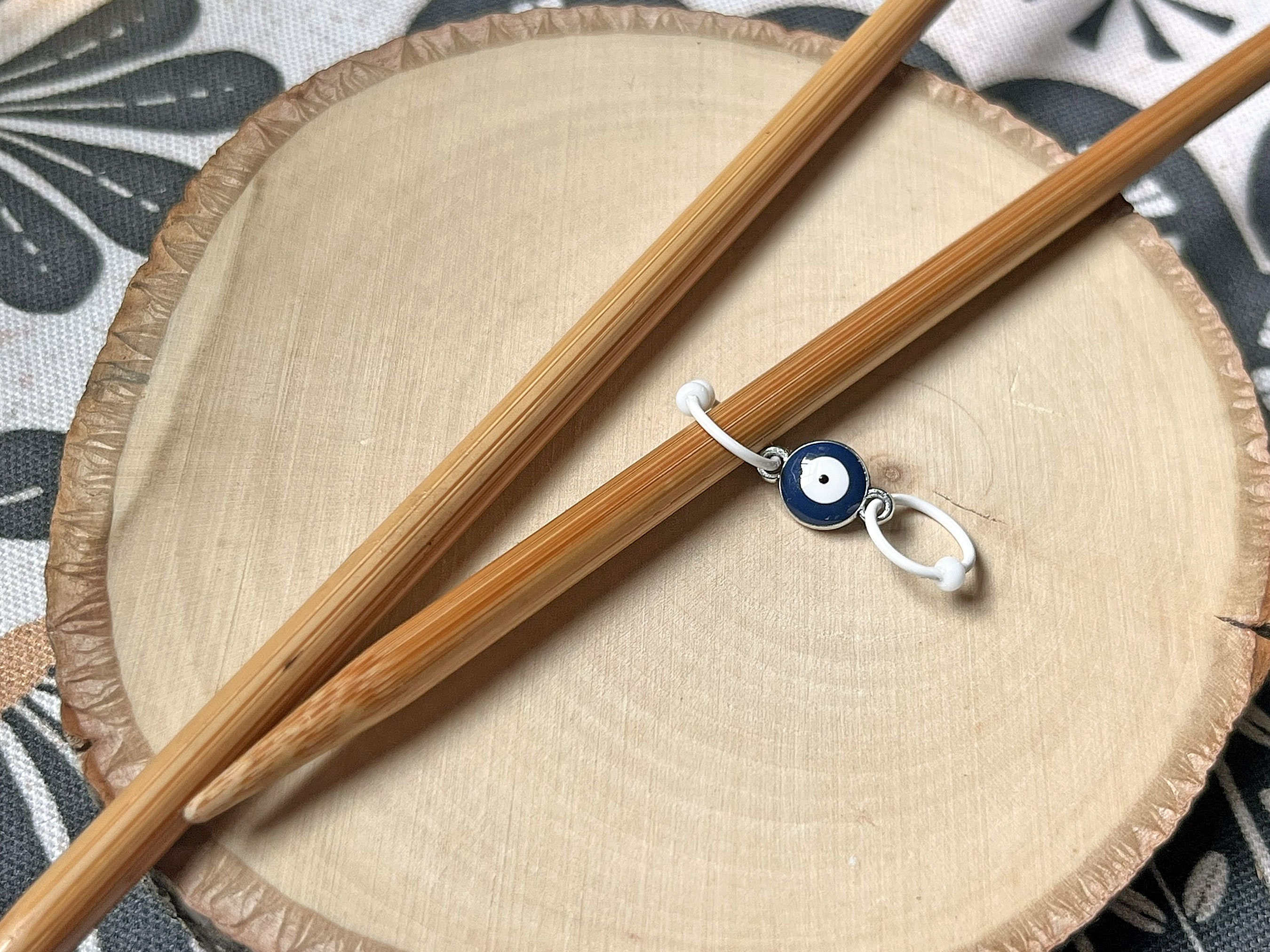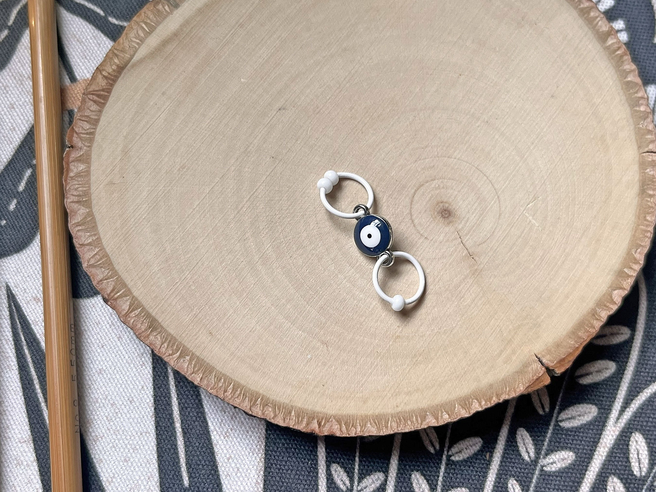 Two row counters are perfect for marking increase and decrease rows or plain and pattern rows. Mine are made with 18 gauge wire, one ring has one bead, the other has two. One bead = plain/decrease round. Two beads = pattern/increase round. This design features an evil eye connector. The dark blue with white center represents protection from bad karma and fate.