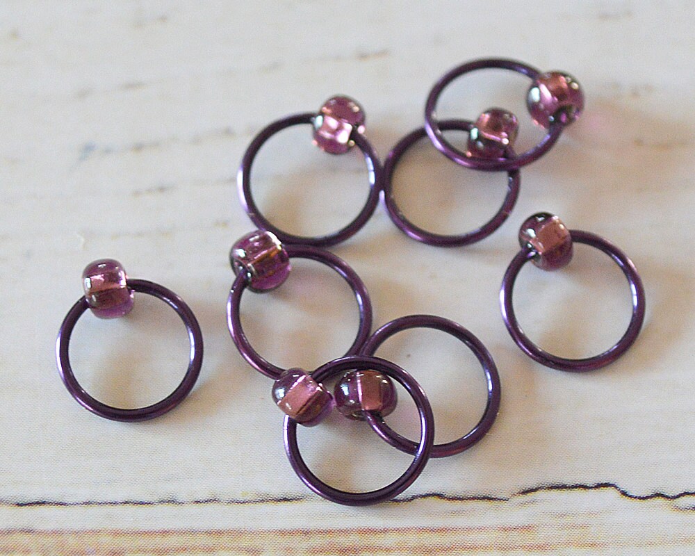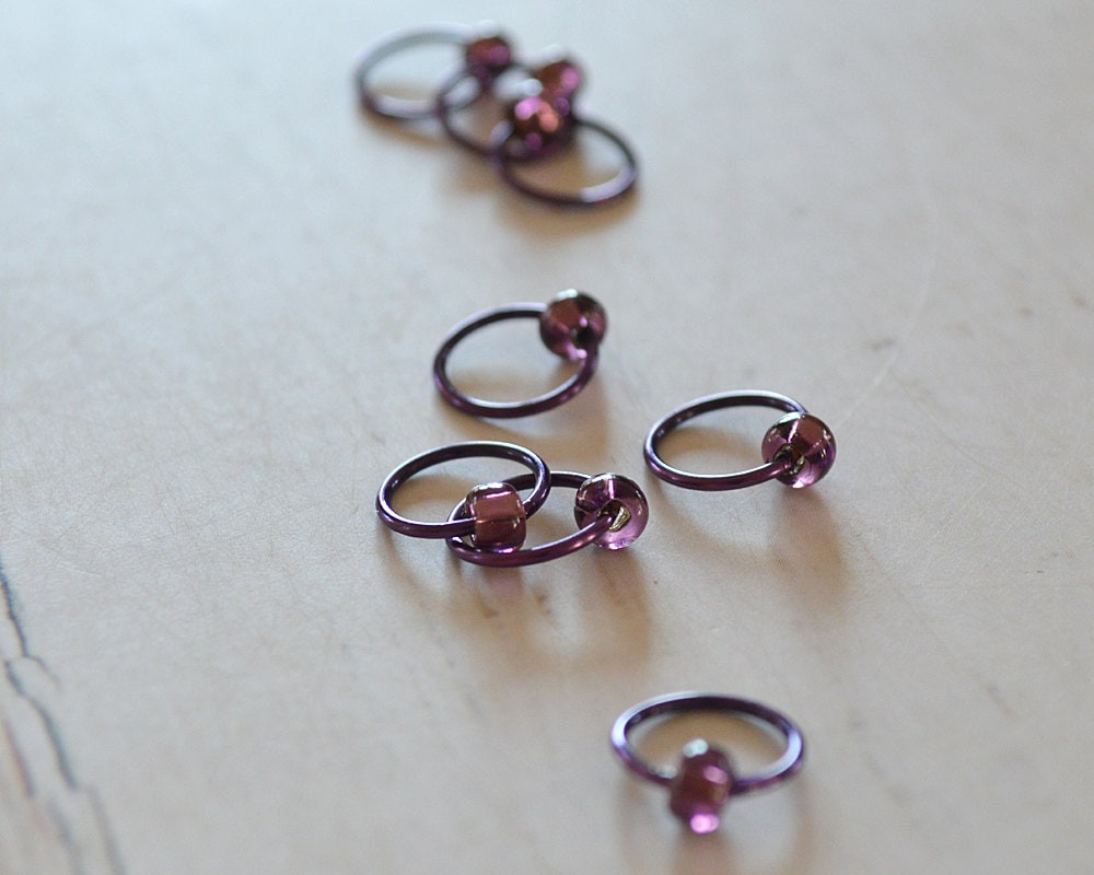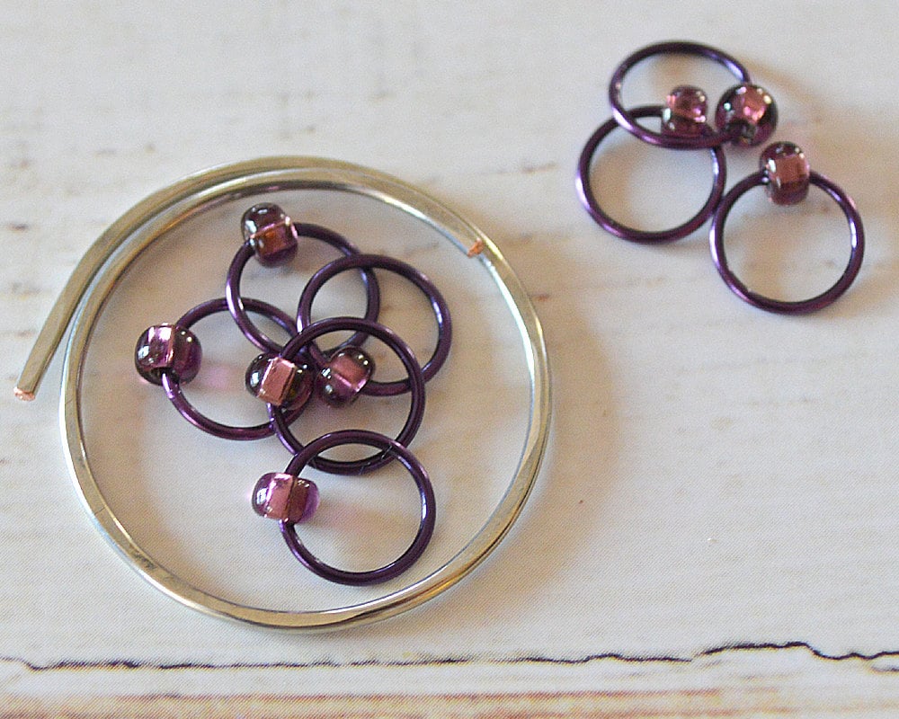 Purple 18 gauge wire is paired with purple beads in this set of markers inspired to provide a pop of color to your knitting.