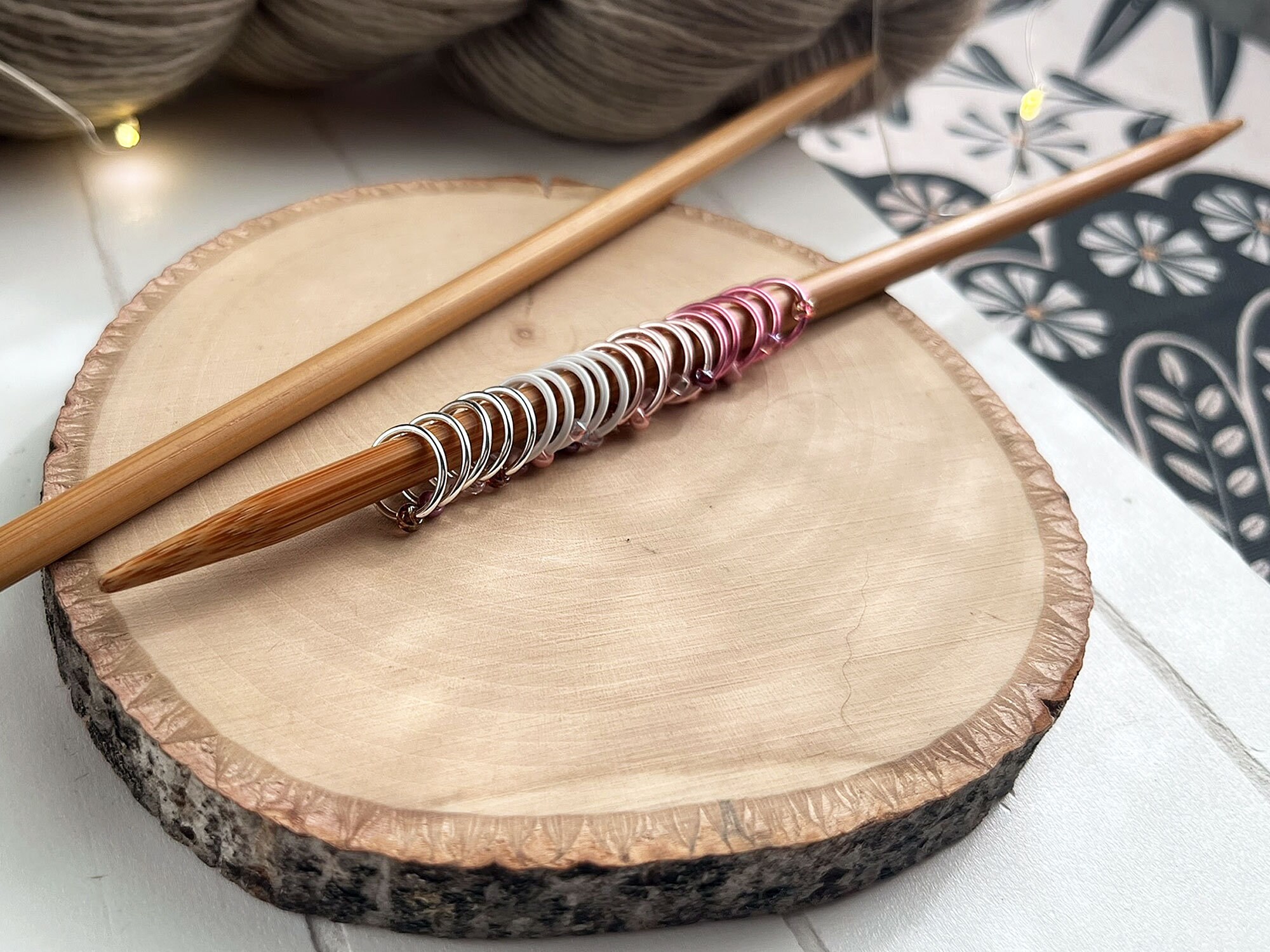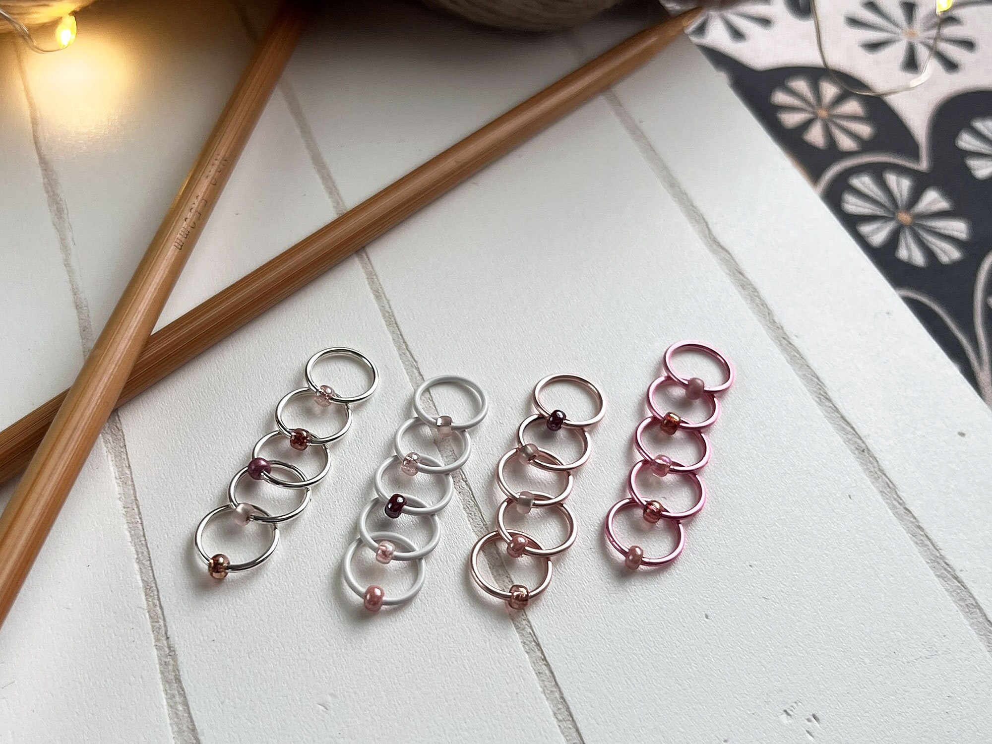 The combination of beads and wire in this design reminded me of Glinda the Good Witch from The Wizard of Oz, a movie that has been my favorite since I was a little girl. The wire rings come in silver, matte white, rose gold, and pink, adorned with beads in various shades of pink. These beads are size 8/0 Czech seed beads, which are slightly smaller than the ones I usually work with. The colored wire not only looks stunning but also pairs well with contrasting yarn in different projects. Additionally, the vibrant colored wire makes these pieces easy to spot!