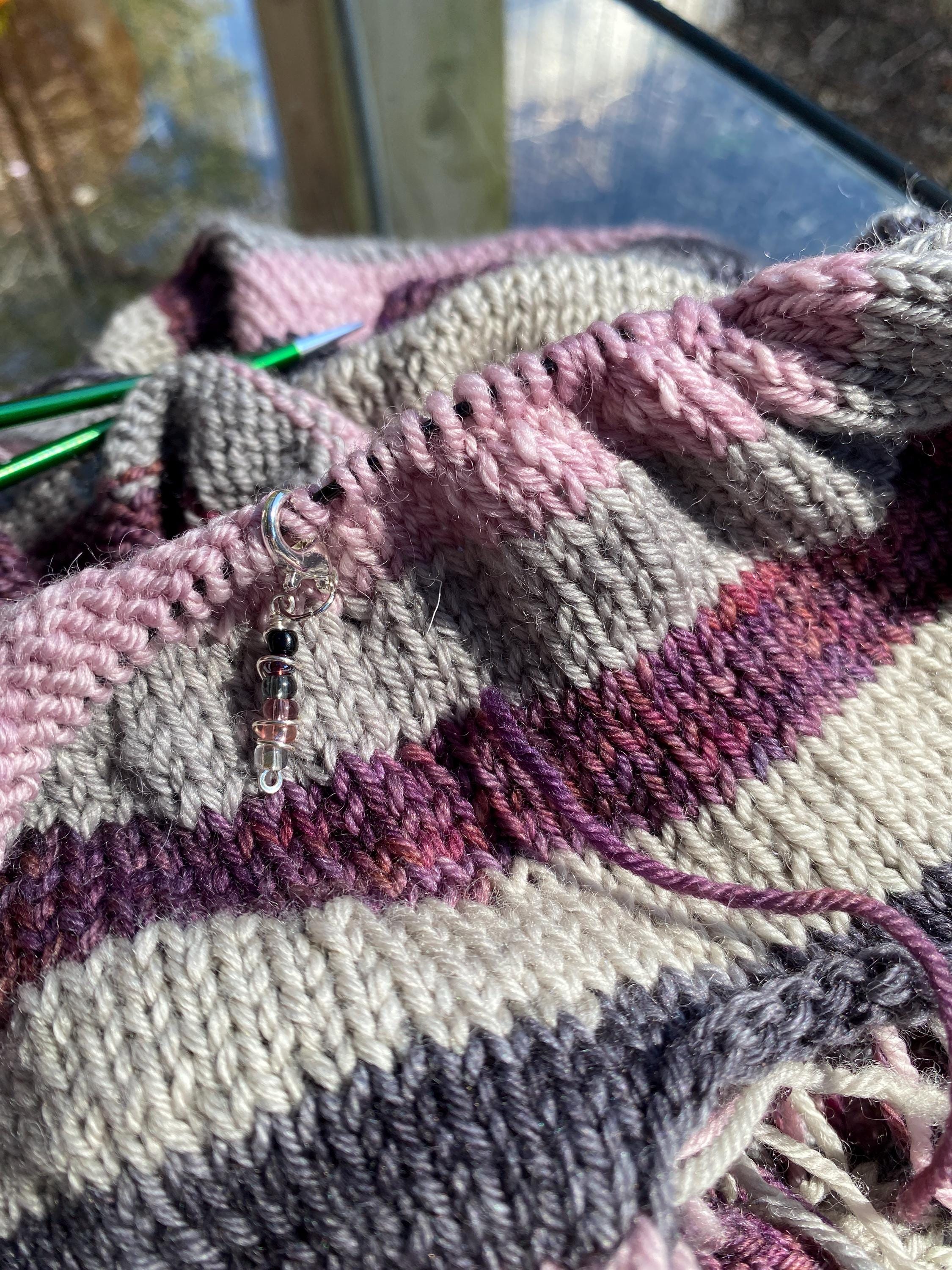 Silver rings are paired with beads in an assortment of colors to show a fade from clear through hues of purple and ending in black. The removable marker in this collection perfectly reflects the fade from bead to bead and is carefully twisted with silver wire for added detail and visual interest. This marker is perfect for marking the right side of your work and can show how much progress you've made on your WIP in any given sitting. It's also useful for securing a dropped stitch and can also be used on crochet projects as well. Or, attach it to one of the ringed markers and it denotes the beginning of the round when knitting in the round. So many possibilities wrapped up in one beautifully crafted marker. Made to order in 4 sizes, small and medium seem to be the most popular ;)