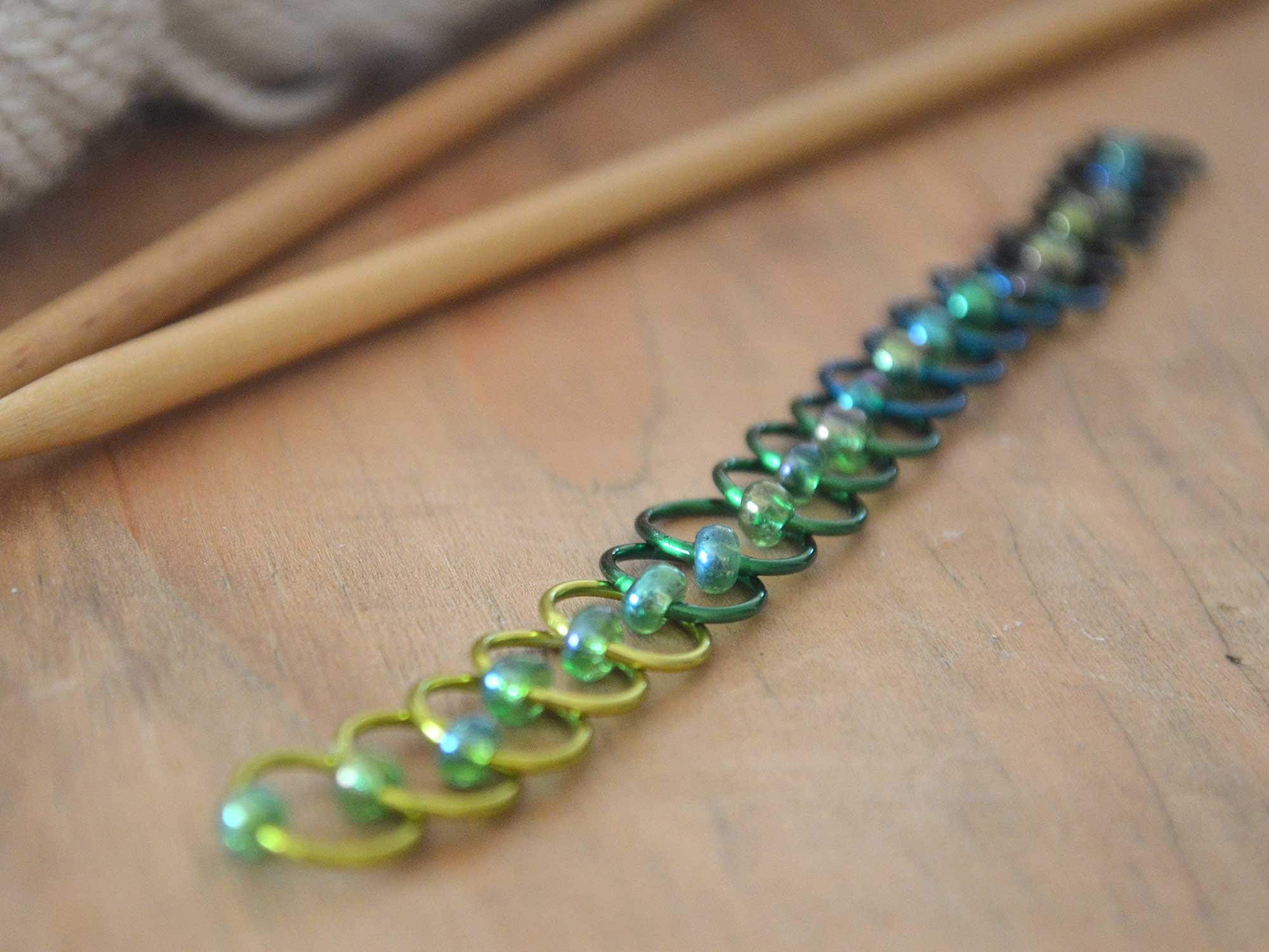 Gold, green, blue and black 18 gauge wire is matched with iridescent glass beads in this set of markers named and inspired by the colors of a mermaid tale. Each set will include an equal number of each of the four colors represented in this design.