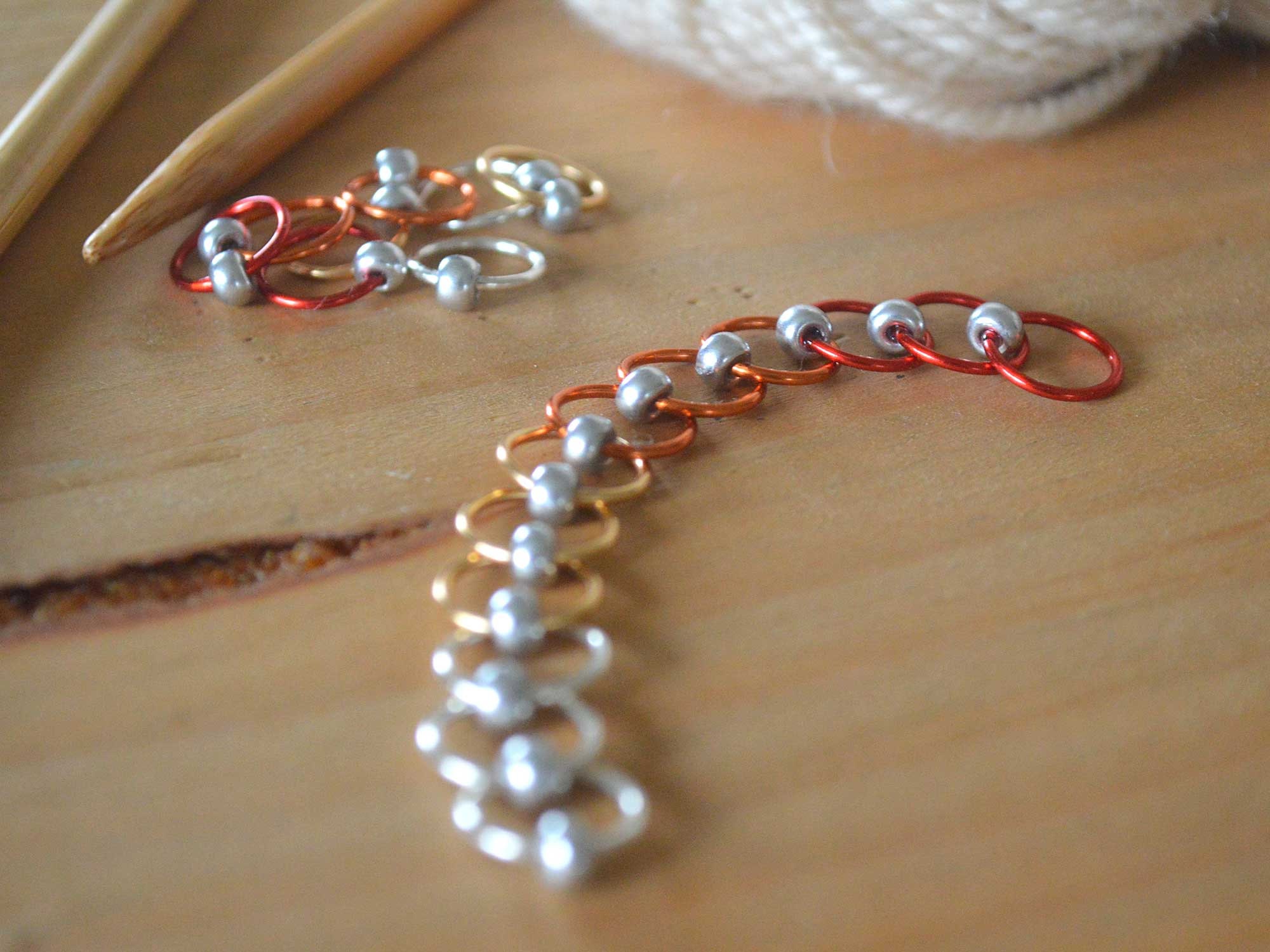 Silver, yellow, orange and red 18 gauge wire is matched with silver beads in this set of markers named Ablaze. I love the transition of wire color in this set! It reminds me of the different hues of a camp fire burning fiercely and providing warmth. Each set will include an equal number of each of the four colors represented in this design.