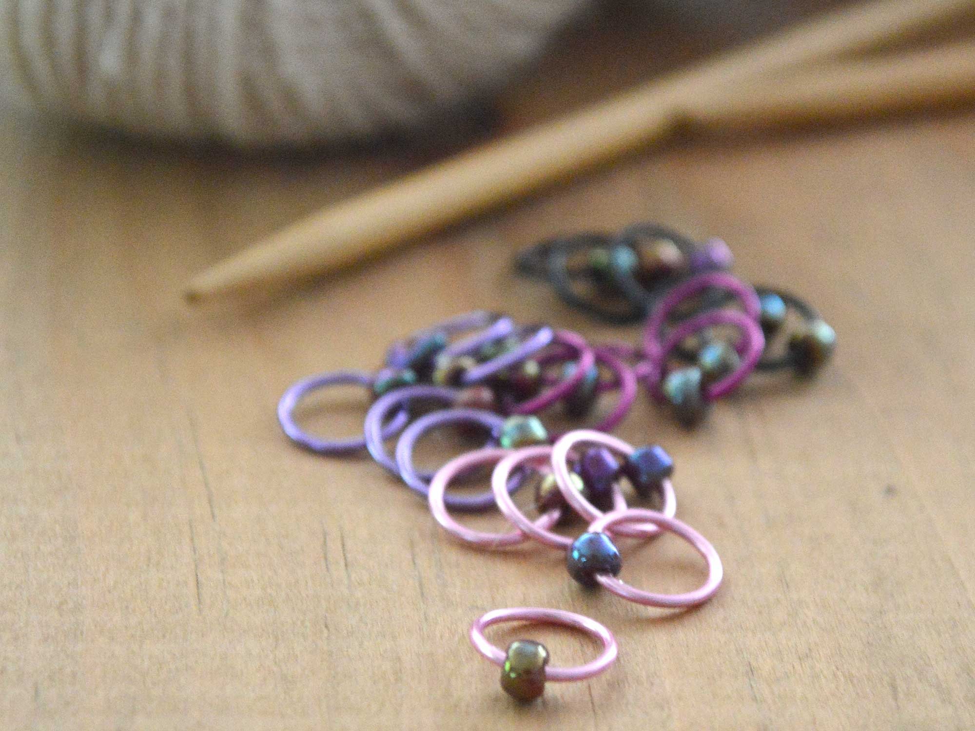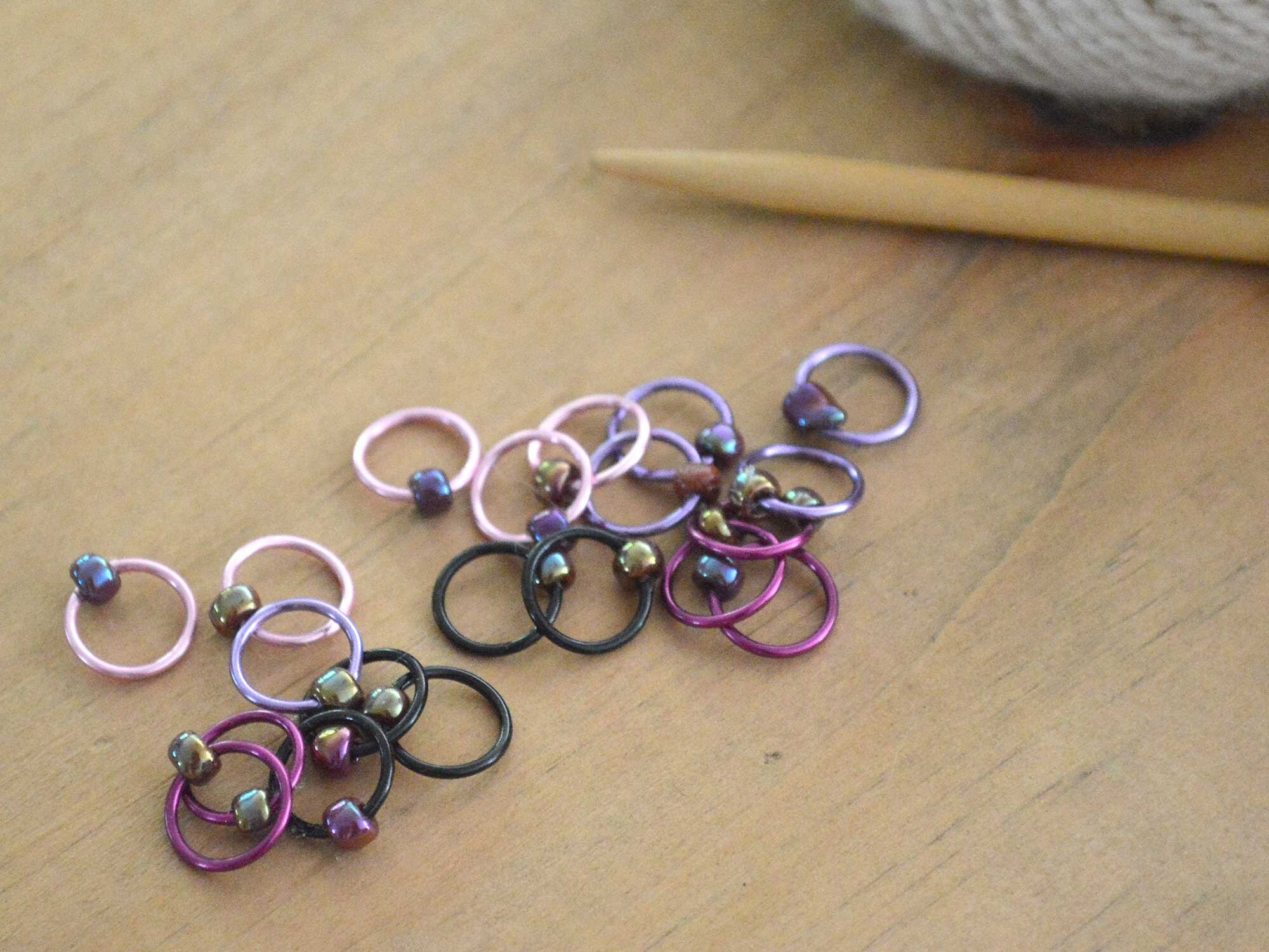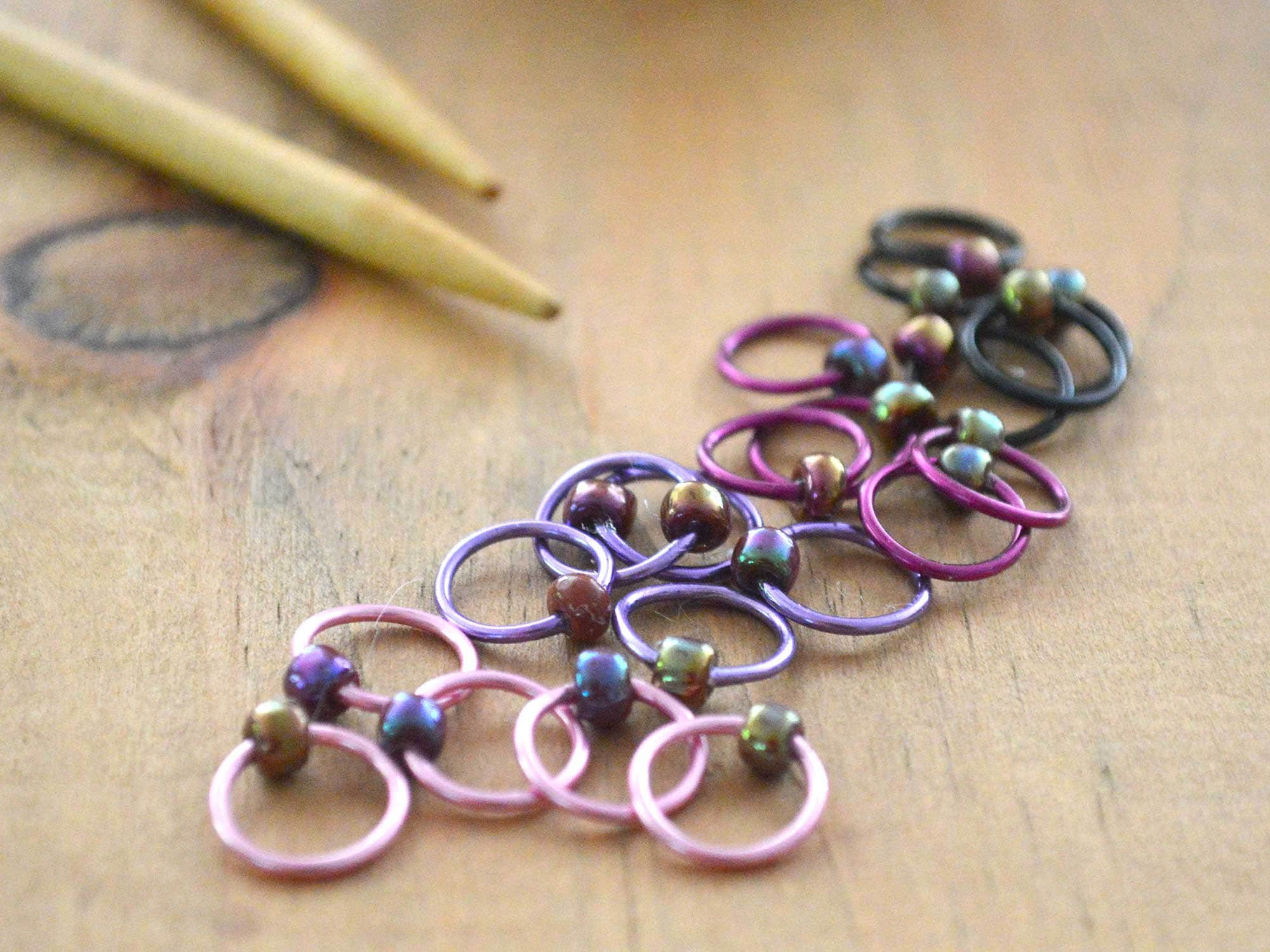 Pink, lavender, fuchsia and black 18 gauge wire is matched with iridescent glass beads in this set of snag free stitch markers. Each set will include an equal number of each of the four colors represented in this design.
