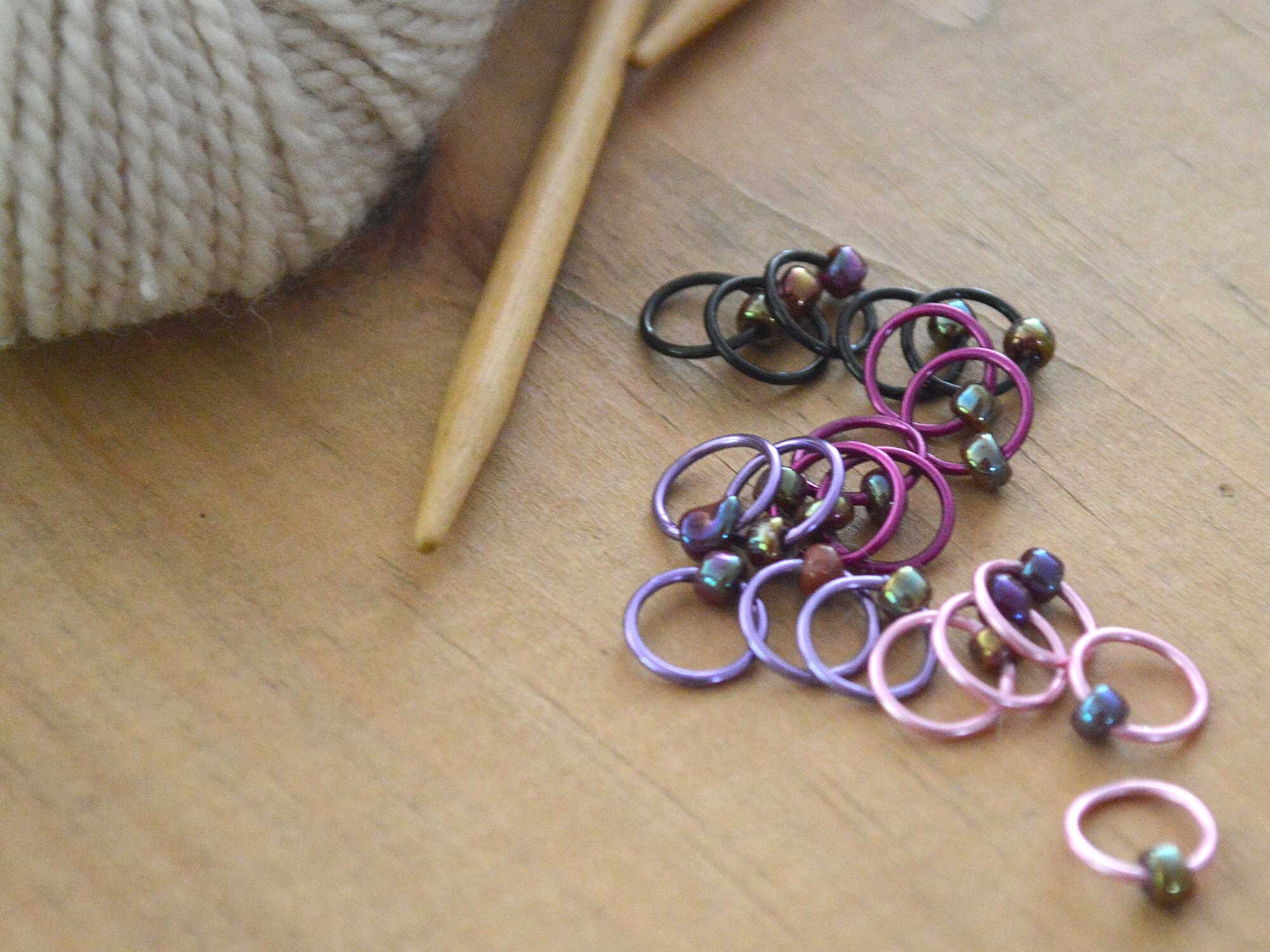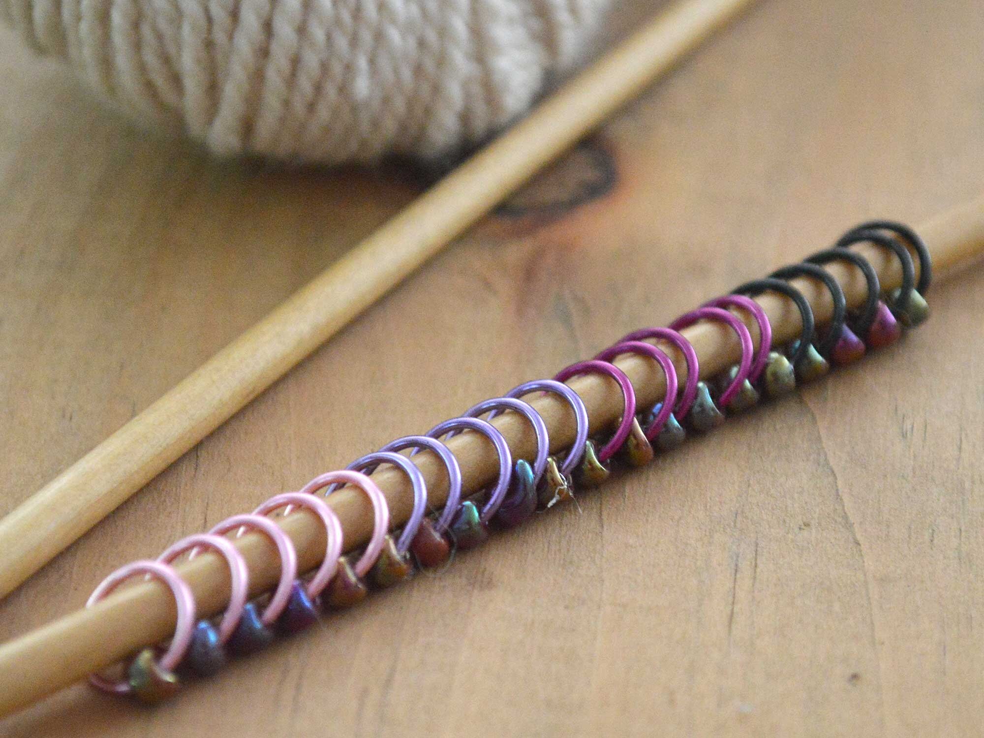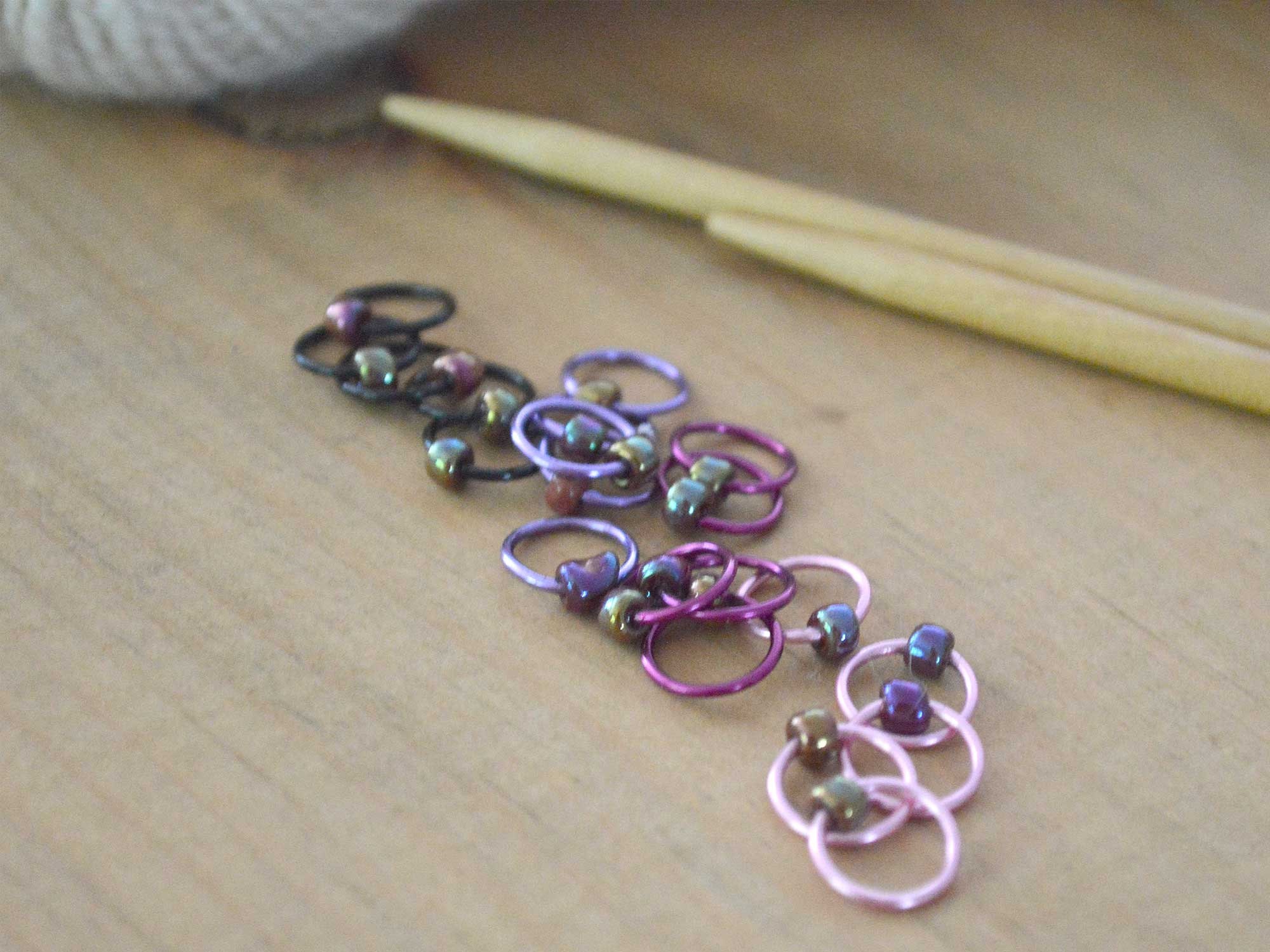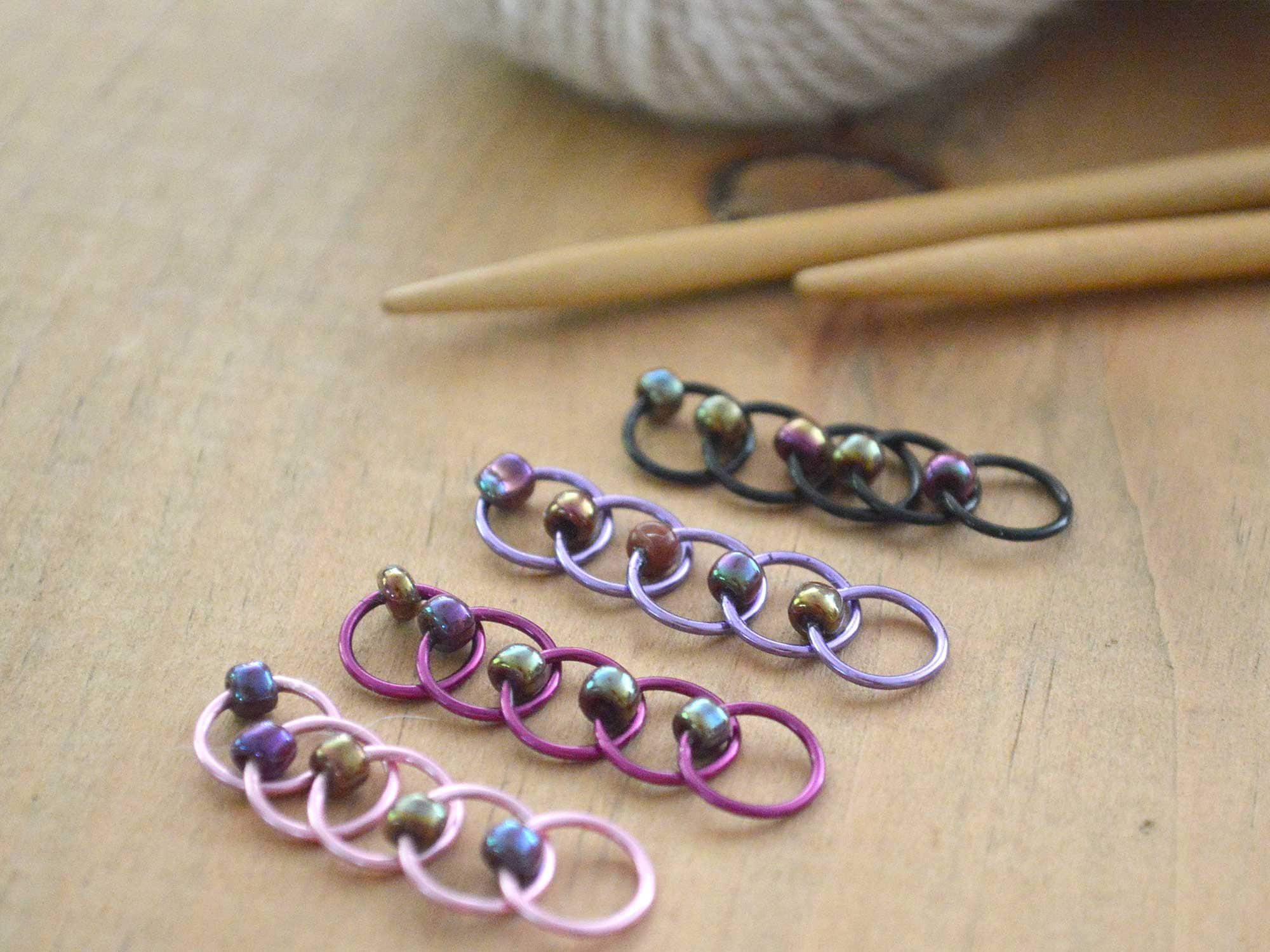 Pink, lavender, fuchsia and black 18 gauge wire is matched with iridescent glass beads in this set of snag free stitch markers. Each set will include an equal number of each of the four colors represented in this design.